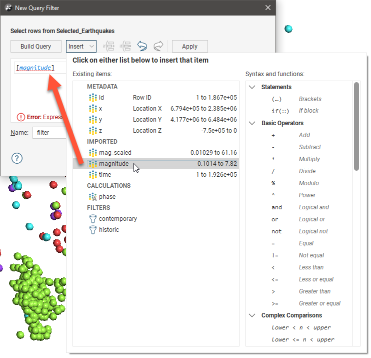 The Insert list will assist you in constructing a valid query in the same syntax as used for Calculations and Filters. For full details on each of the Existing items and Syntax and Functions, see Catalogue of Metadata, Syntax and Functions.