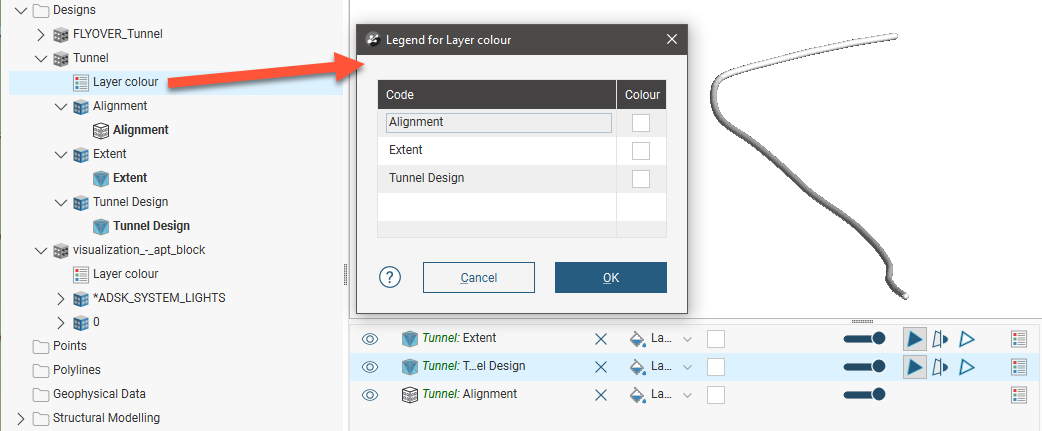 All models and layers available in the selected files will be displayed. Here three files have been selected for import, FLYOVER_Tunnel, Tunnel and visualization_-_apt_block: