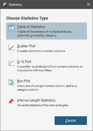 Once you have created a composited table, you can view statistics on the table. To do this, right-click on it and select Statistics. The following options are available: