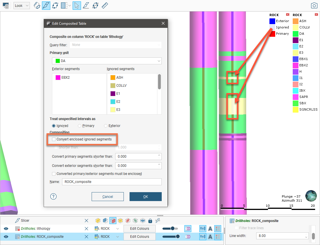 Where ignored segments are at the end of the drillholes and thus have no primary unit on the other side to enclose them, the ignored segments are not converted: