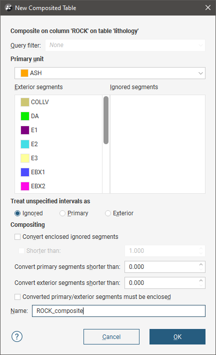 Right-click on the Composites folder, which is in the project tree as part of each drilling dataset, and select New Category Composite. You will be prompted to select from the category columns available in the drilling data. Next, the New Composited Table window will appear, showing the options for sorting intervals in the selected column: