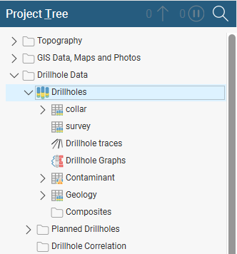 Here, a single drilling dataset made up of a number of tables has been added to the project, stored in the Drillhole Data folder: