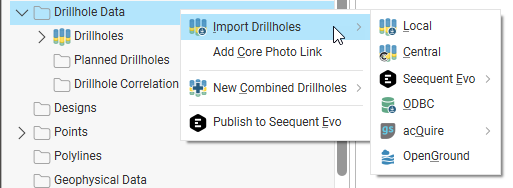 Drilling data forms the basis for creating models in Leapfrog Geo. Import drilling data by right-clicking on the Drillhole Data folder and selecting one of the import options: