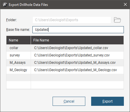 Once you have selected how you wish to export the data, click OK. The Export Drillhole Data Files window will appear: