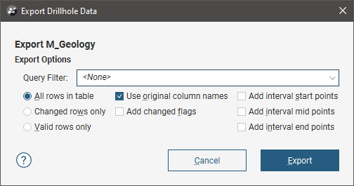 You can select whether the exported file includes all rows, only changed rows or only valid rows. You can also apply a query filter, if any have been defined for the drilling dataset.