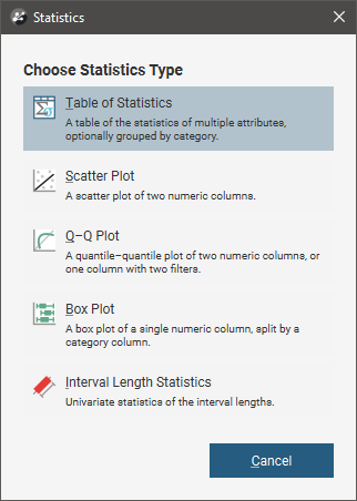 Once you have created a composited table, you can view statistics on the table. To do this, right-click on it and select Statistics. The following options are available: