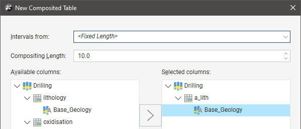 Drilling data is composited from the Composites folder, which is in the project tree as part of each drilling dataset. To create a majority composite, right-click on the Composites folder and select New Majority Composite. The New Composited Table window will appear. Select the interval table that will be used to specify the intervals for the new majority composite or specify a fixed Compositing Length. Next, select the columns that will be composited.