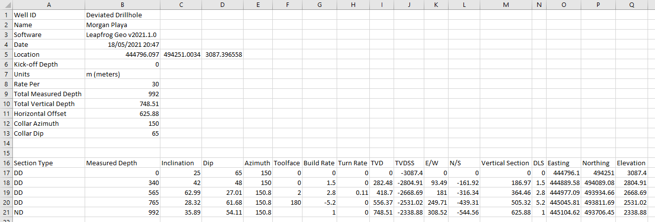 A planned multiple deviation drillhole can be exported as a points table in *.csv format. The file will contain X, Y and Z values, along with measured depth (MD) and true vertical depth (TVD) columns. Any evaluations on the drillhole can also be included.