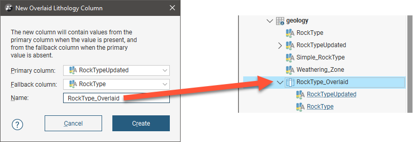 The New Overlaid Lithology Column window will appear. For the Primary column, select the column that you wish to have precedence. Data in the Fallback column will be used when no data is available from the Primary column. Here, the RockTypeUpdated columns will be used as the Primary column and intervals in that column that don’t have data will use the RockType column:
