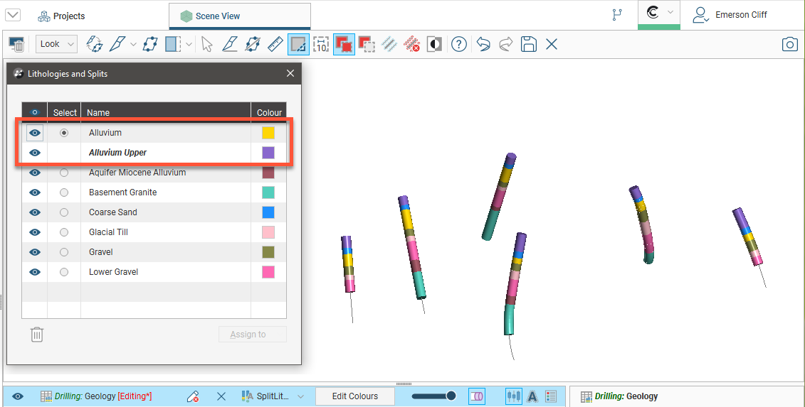Once you have created the split lithology column as described in Creating a Split Lithology Column, the next step is to select the base column lithology that will be split. In this example, we will create splits for a base column lithology called Alluvium: