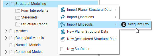 Driver publishes ellipsoid data to Seequent Evo as a local ellipsoid geoscience object that can be used to create a structural trend in Leapfrog Geo. To start, you must first import the data from Evo. To do this, right-click on the Structural Modelling folder and select Import Ellipsoids > Seequent Evo: