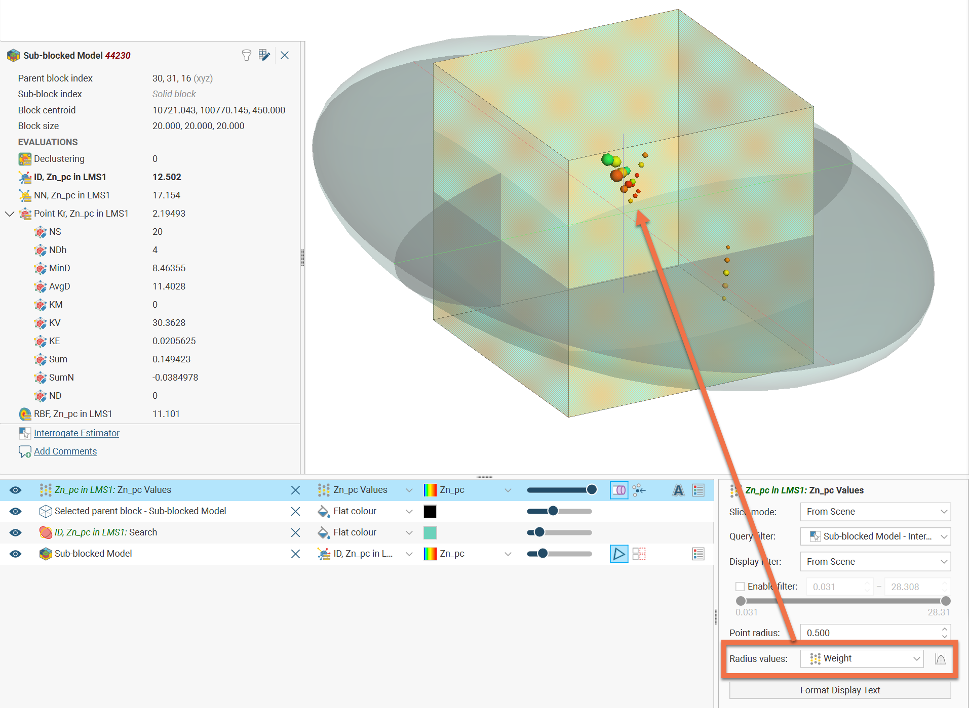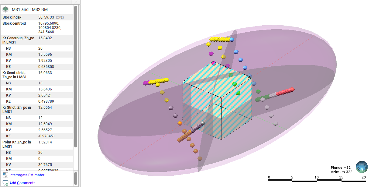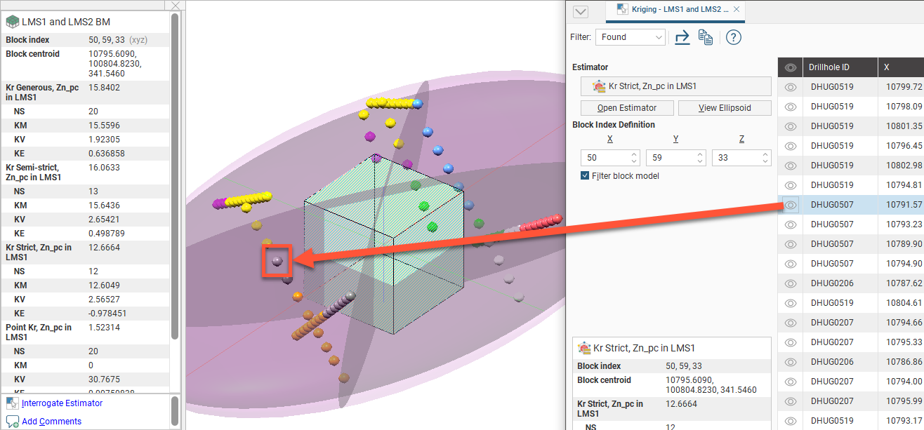 Enable Filter block model to see only the selected block in the scene, which will reduce the visual noise of all the other blocks. This will help you see the associated data points and the search ellipsoid in relation to the selected block:
