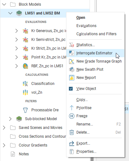 It is good practise to check the estimates produced for blocks, inspecting the data used to create the estimate. The block estimate interrogator exposes the data used to produce an estimate. Right-click on a block model in the project tree and select Interrogate Estimator.