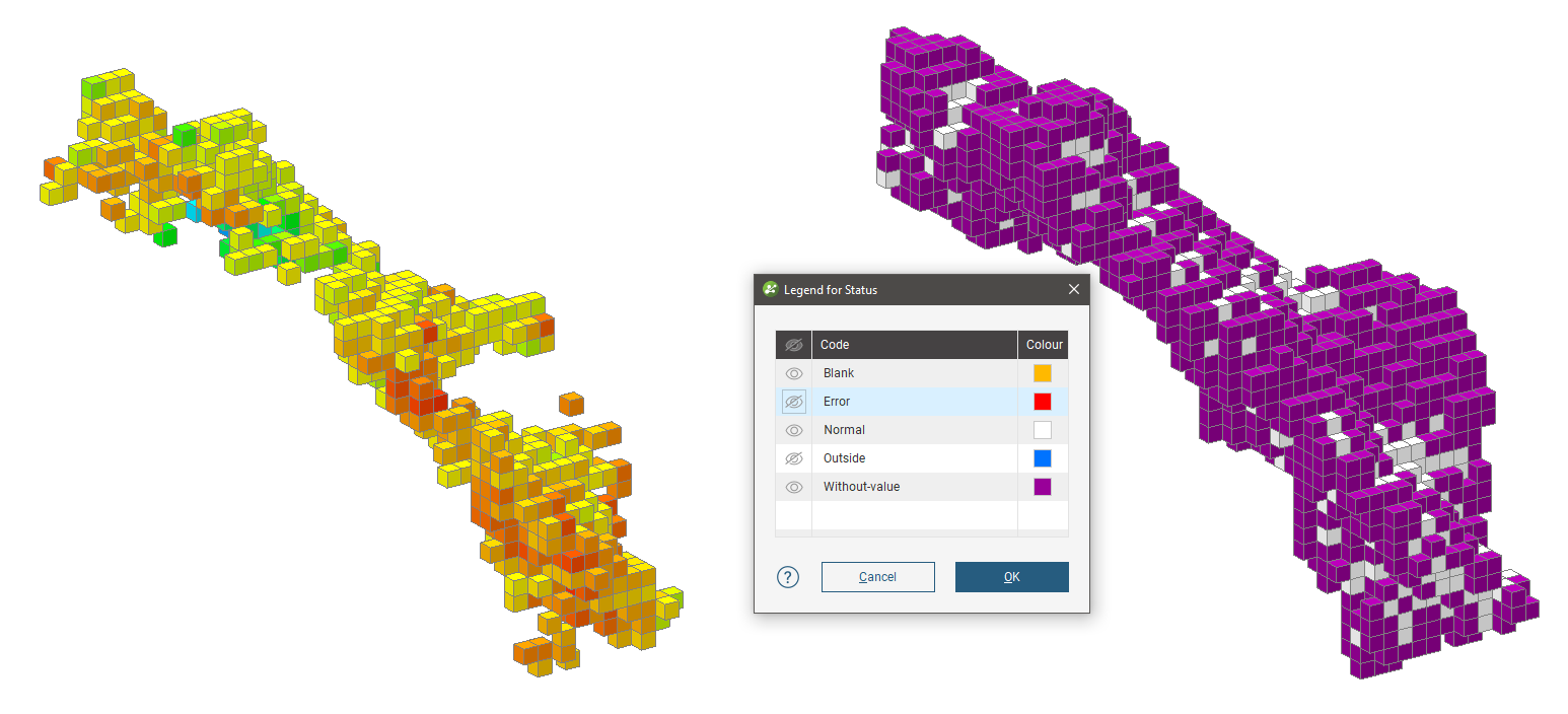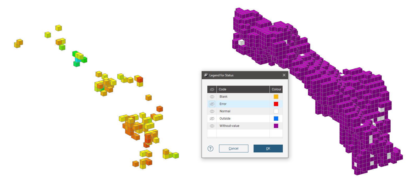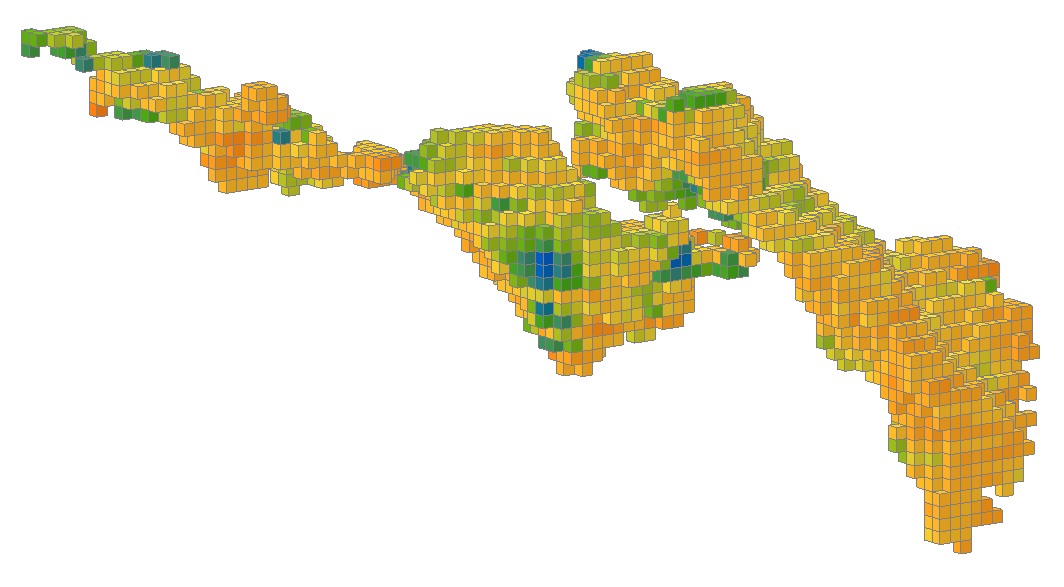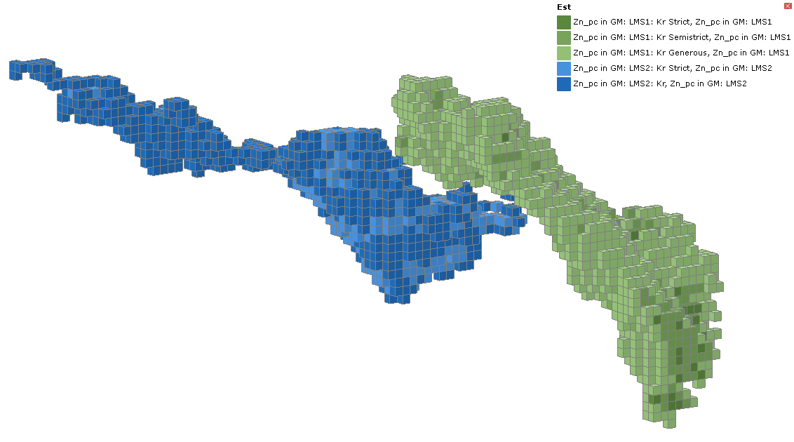 When the combined estimator is evaluated onto a block model, all the estimated blocks can be displayed in the scene, combining the domains.