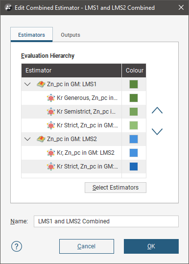 When these estimates are combined in that order, the blocks are only represented by an estimate if it has not already been given an estimate by a higher priority estimate in the hierarchy. The resulting block model evaluation may look a lot like the estimate with the most blocks, but an inspection of the evaluations of each of the blocks would reveal the subtle differences where blocks have been estimated with higher priority estimators.