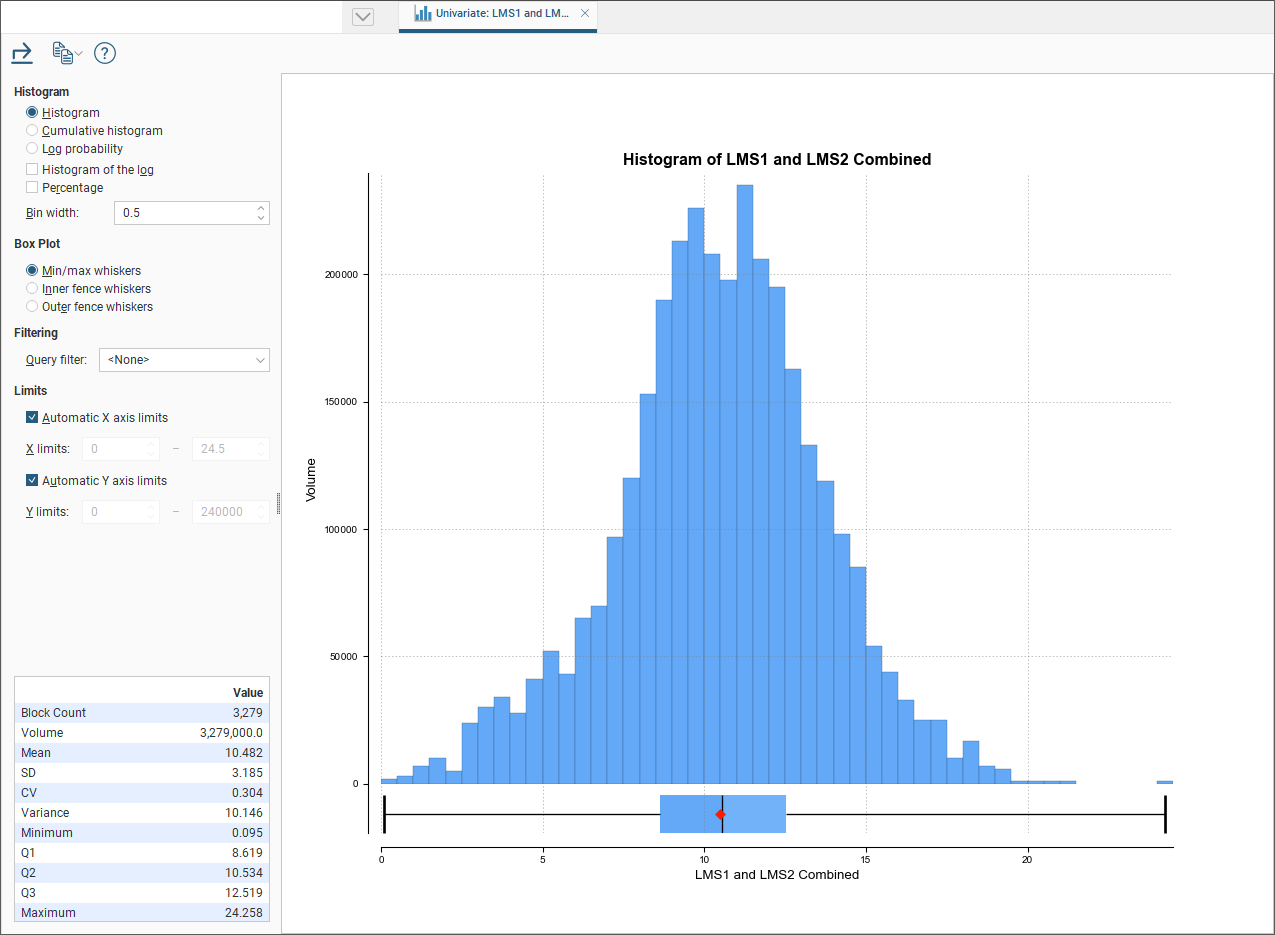 Right click a combined estimator evaluation on a block model, and select Statistics. For more information on the univariate statistics displayed, see Univariate Graphs.