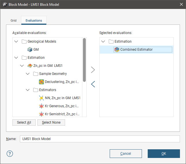 Combined estimators can only be evaluated on a block model. Right click a block model and select Evaluations, then select a combined estimator from the Available evaluations and add it to the Selected evaluations list. Click OK.