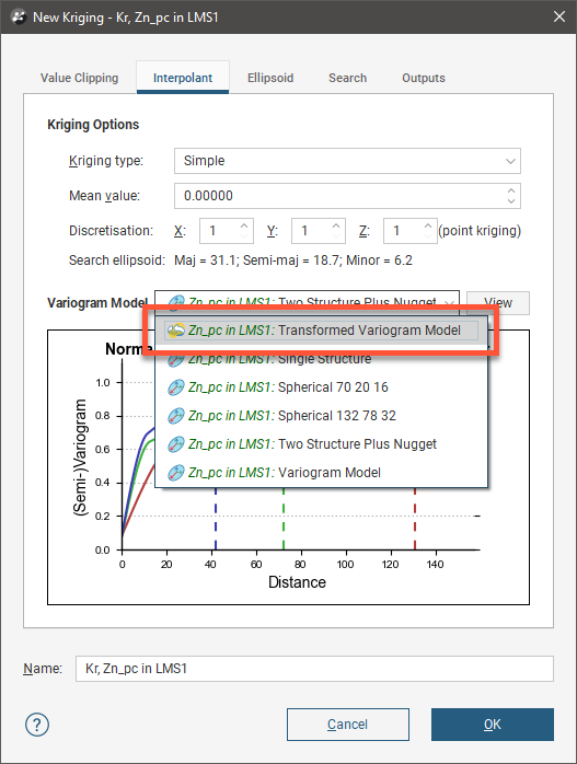 If multiple variogram models exist in the domain, a dialog will appear asking you to select which variogram model to use to obtain the experimental parameters for the new transform variogram model: