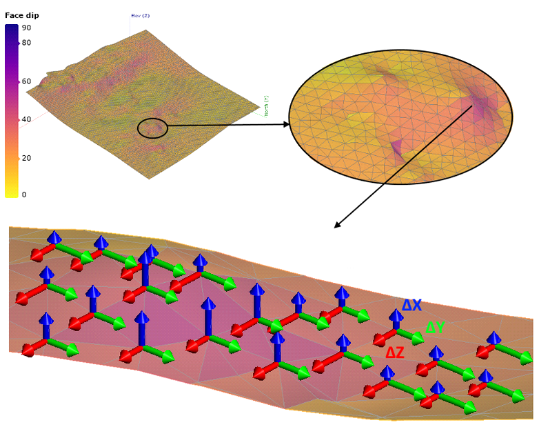 At each vertex of the input mesh, a normal unit vector is calculated from the average orientation of the faces that meet at that vertex. This normal vector is then resolved into three orthogonal component vectors, Δx, Δy and Δz. Take a close look at this slice of an undulating part of a hangingwall mesh shaded according to the face dip: