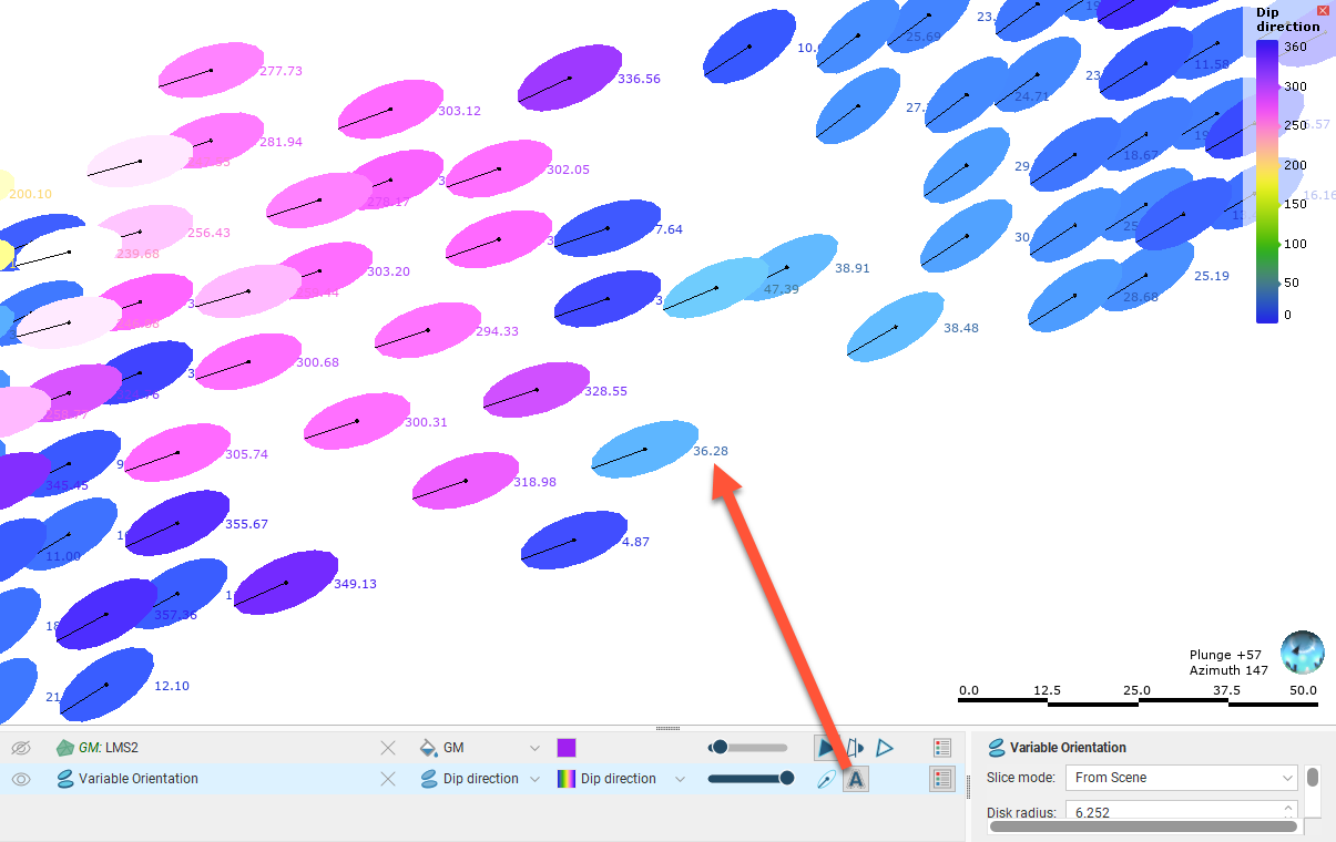 Here a variable orientation is visualised on a custom grid, with disks coloured using the Dip direction values at each point on the grid. Enabling text display (