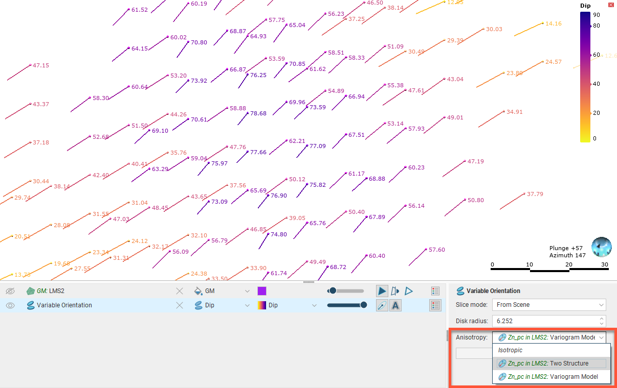 You can also change the Anisotropy used to display the variable orientation. Options are Isotropic and any variogram models and search spaces defined in the estimation: