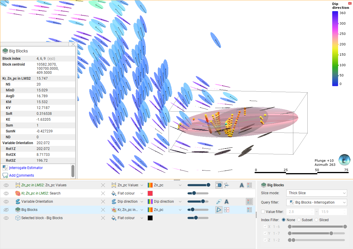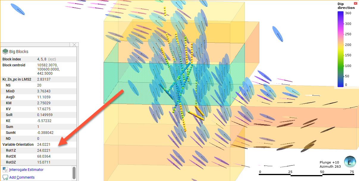 Here the viewing angle is the same but a nearby block is selected, showing a different orientation for the widget. This reflects the effect of the variable orientation on this block, demonstrating that each block can have a different search space and variogram orientation: