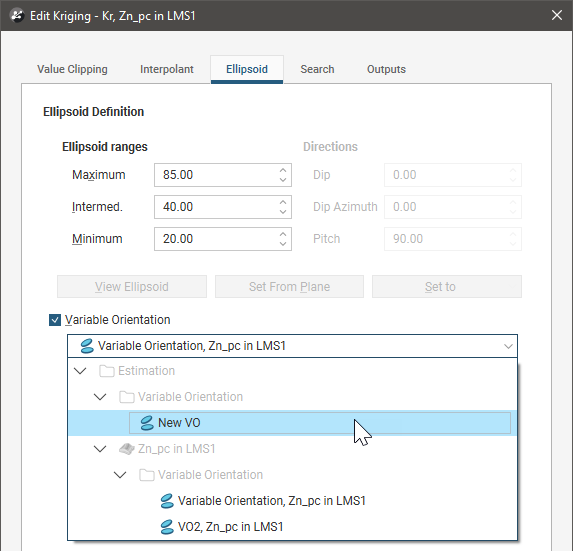 You can create variable orientations in the Estimation > Variable Orientation folder and in a domained estimation’s Variable Orientation folder. See Creating Variable Orientations later in this topic.