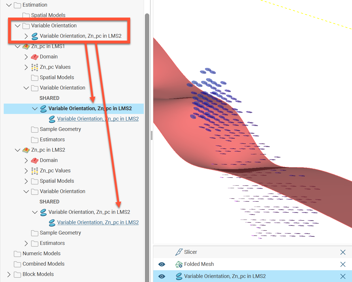 In domained estimations, variable orientations applied can be either ‘local’ (available only to that domained estimation) or ‘shared’ (from the Estimation > Variable Orientation folder). Here in the Zn_pc in LMS1 domained estimation, the variable orientations are organised into local and shared subsets: