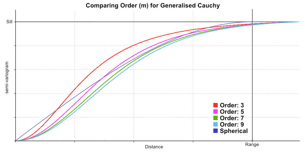 This can in turn be expressed as a variogram function for the Generalised Cauchy variogram of order m: