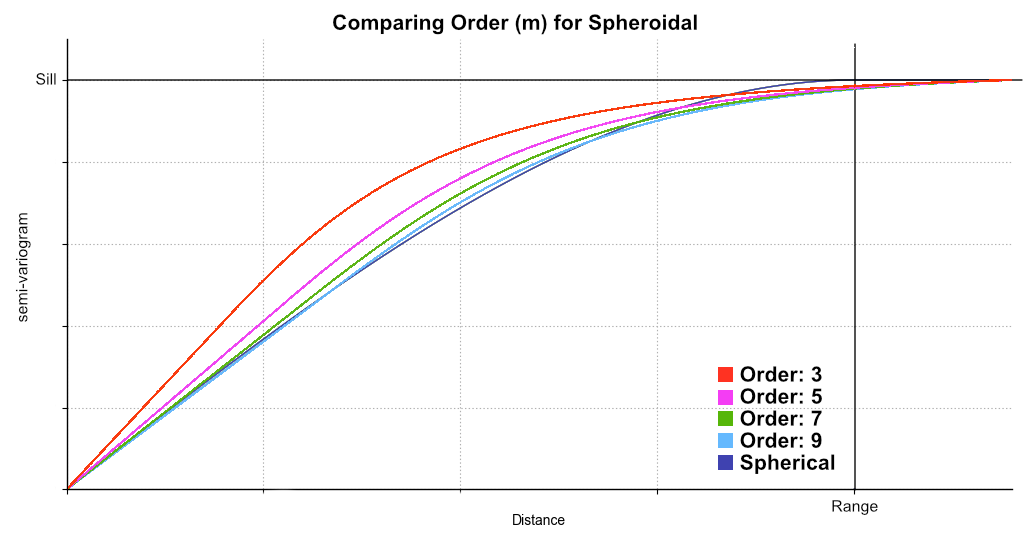 This has the effect of ensuring that the Spheroidal variogram reaches 96% of the sill at the ‘practical range’ with no nugget. Beyond the practical range, a point has a small but non-zero correlation. For further details on the derivation see The Spheroidal Family of Variograms Explained on the Seequent blog.