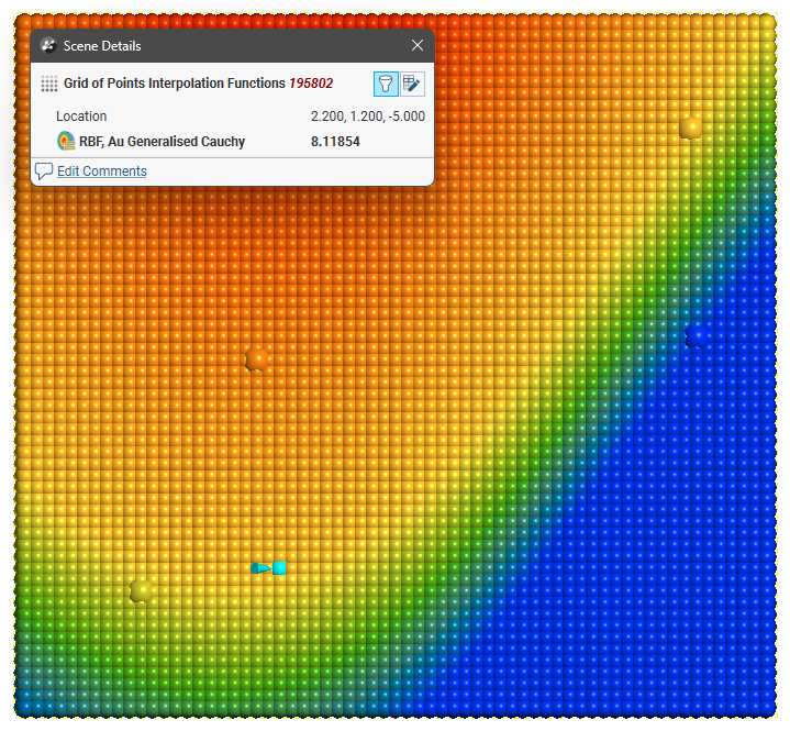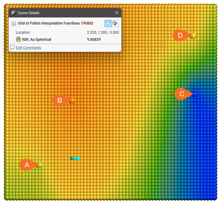 For each model type, the effect of the interpolation function is depicted by evaluation onto a grid of points, using as input just four samples, A = 7, B = 14, C = 2 and D = 8. A thin slice is taken through the grid of points to provide a sort of 2D visualisation of the operation of the function. One of the points has been selected in each view to display the value being estimated for a specific location.