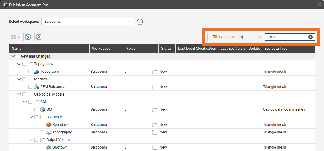 You can also filter the list to limit the number of objects displayed. For example, here we have used the filter to restrict the list to the term ‘mesh’, which shows all objects that include ‘mesh’ in their names or whose Evo data type contains ‘mesh’: