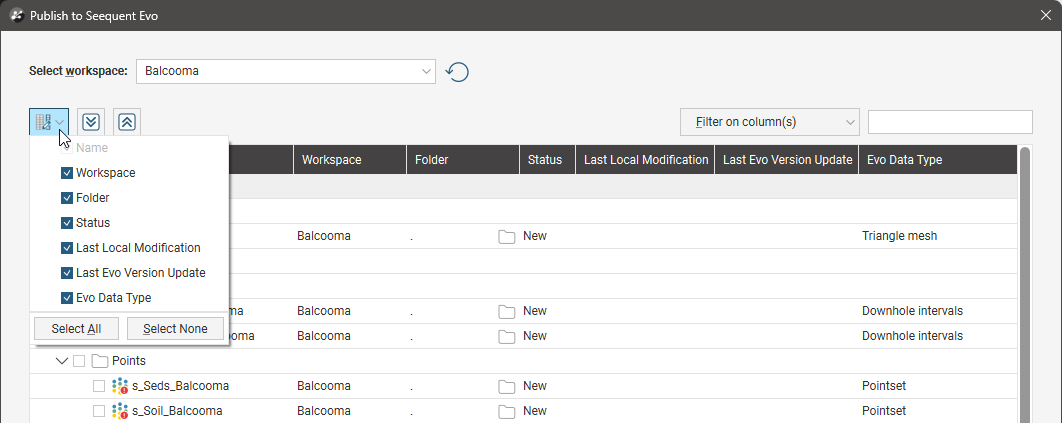 You can choose which columns are used to filter the list by clicking on Filter on columns. When no columns are selected, the filter is applied to only object names, which is why the first filter applied returns no objects. Then when the Evo Data Type column is selected, the data types with ‘mesh’ in their names are listed: