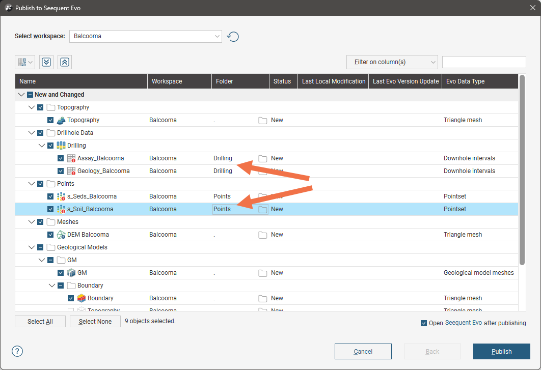 This opens the Publish to Seequent Evo window, which lists all the objects in the project that can be published to Evo along with their Evo data type: