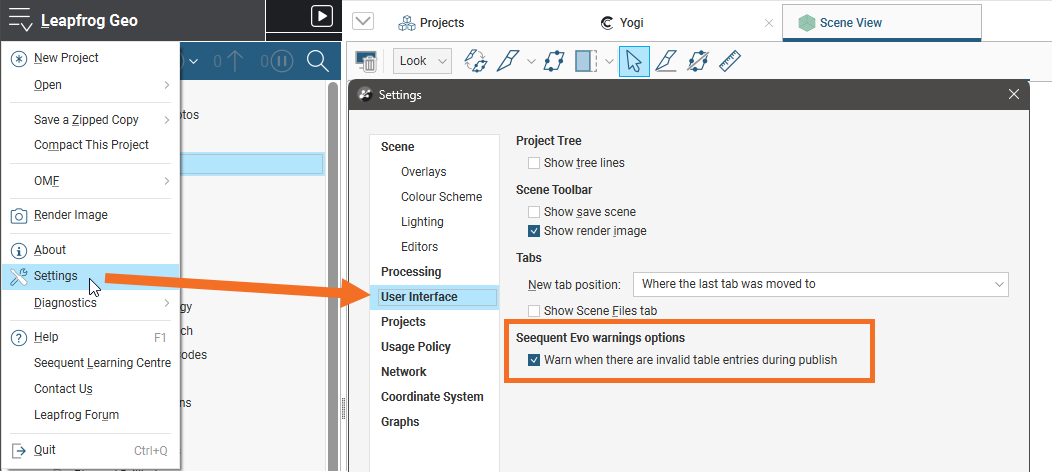 If you no longer wish to see this warning in the currently open Leapfrog Geo project, enable the tickbox. If you later decide you want to see this message when publishing data objects that contain invalid entries, you can enable it via the Settings window. Click on the Leapfrog Geo menu, select Settings, then click on the User Interface tab: