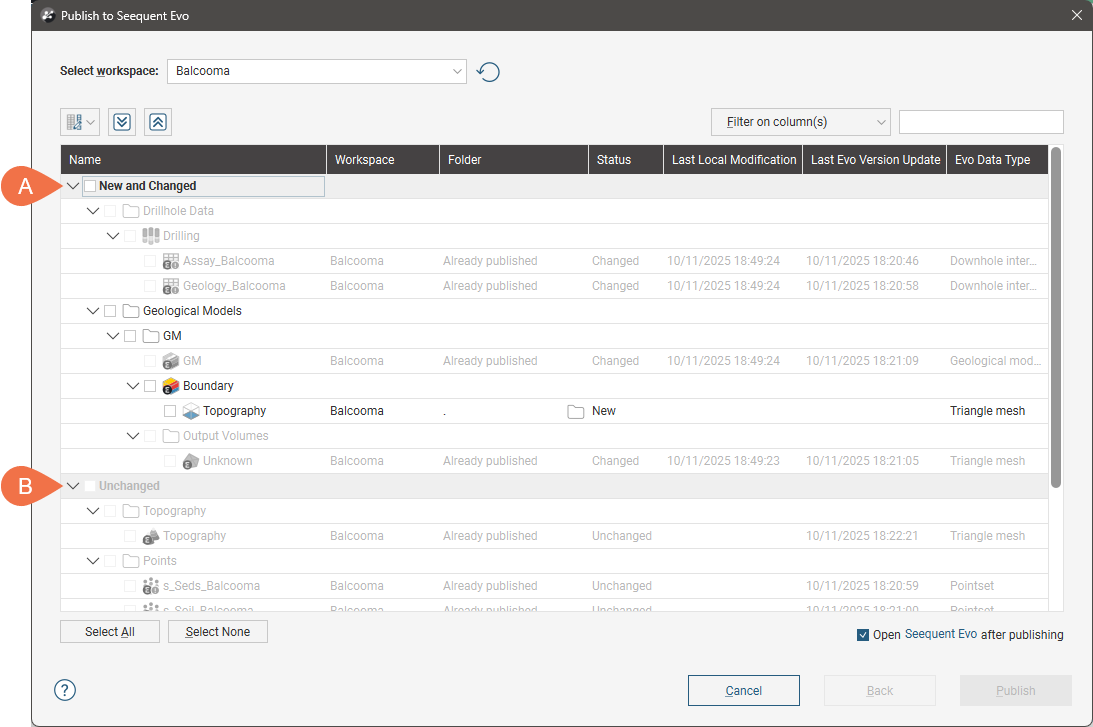 The Publish to Seequent Evo window categorises objects into those that have changed and those that haven’t: