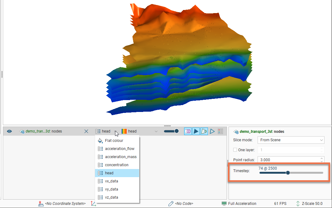 ) object to the scene. When a model with results is displayed, the simulation outputs can be displayed when the nodes are viewed in the scene. Here, the nodes for an imported results file have been added to the scene. The heads are displayed for a single layer: