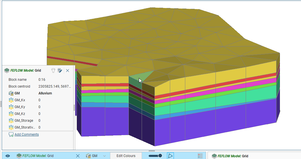 When a FEFLOW model is displayed in the scene, you can view information about the individual blocks in the model by clicking on a block. The window that appears shows information about the selected block, including its centroid and the lithology assigned to the block from all evaluated geological models and interpolants: