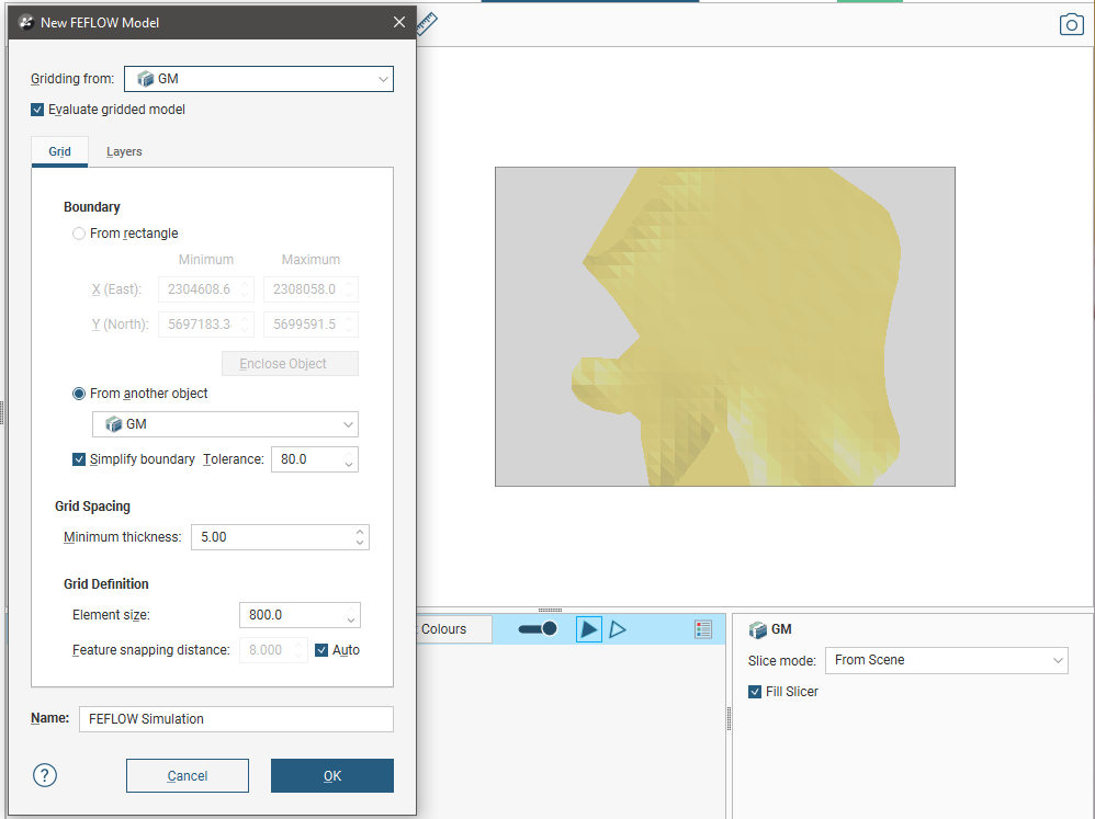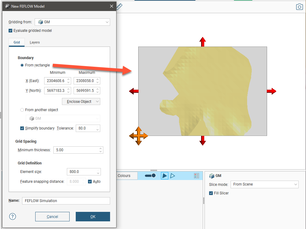In the Grid tab, the model’s boundary can be defined as a rectangle or from another object in the project. In the example above, the geological model GM is used to define the FEFLOW model’s boundary. When the boundary is set to From rectangle, controls will appear in the scene that will help in setting the boundary: