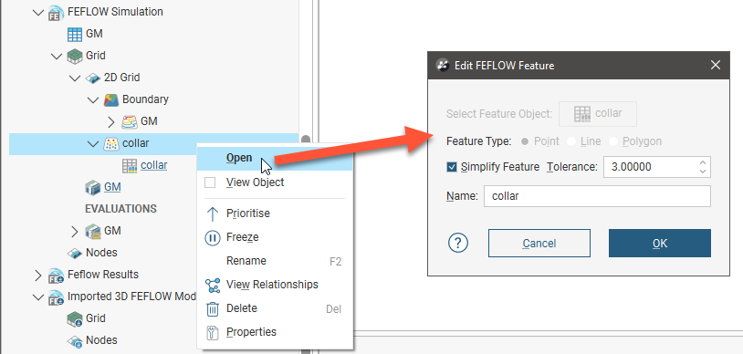 You can edit the feature by double-clicking on it or by right-clicking on it and selecting Open. In the Edit FEFLOW Feature window, you can enable or disable the Simplify Feature setting and change the Tolerance.