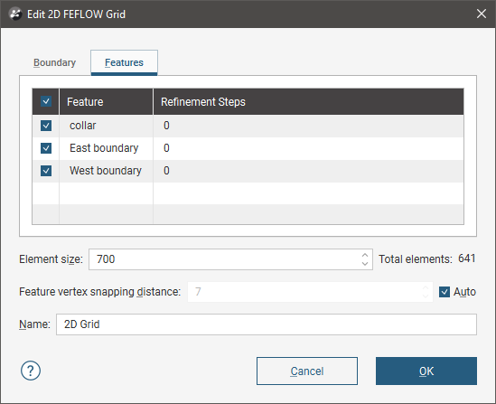 ). This opens the Edit 2D FEFLOW Grid window with the Features tab open, showing all features that have been added to the grid: