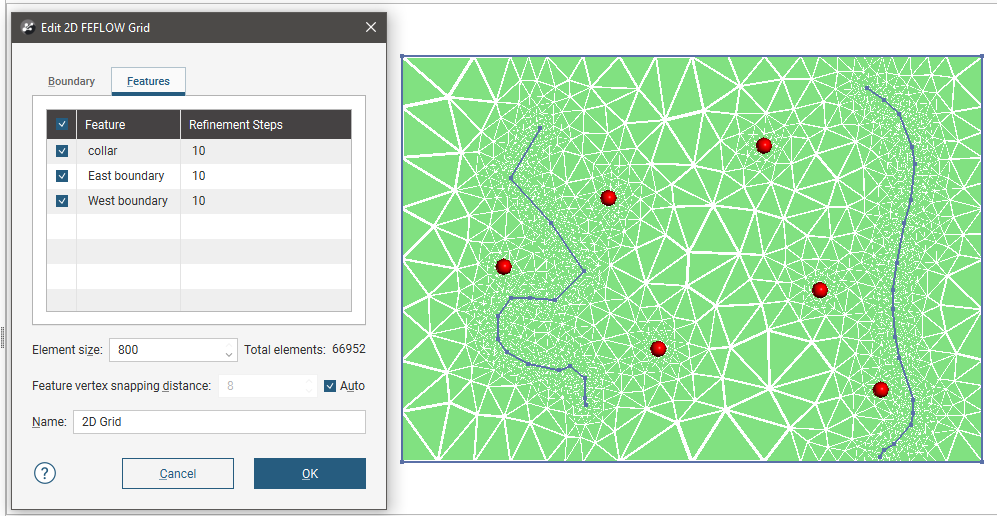 To view all features that have been applied to a FEFLOW model, double-click on the 2D grid object (