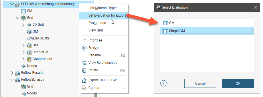 If only one geological model has been evaluated on a FEFLOW model, it will automatically be used as the model for export. If you have evaluated more than one geological model, you can choose which one to export by right-clicking on the FEFLOW model in the project tree and selecting Set Evaluation for Export