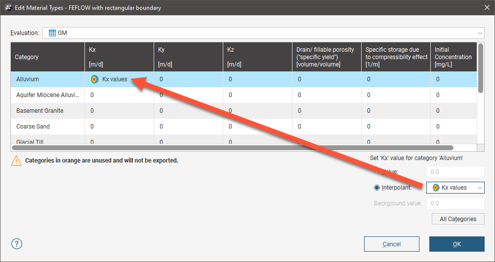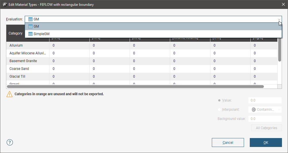 - For 3D FEFLOW models imported into Leapfrog Geo and models created in Leapfrog Geo without an evaluation, a geological model must be evaluated on the model before material types can be set.