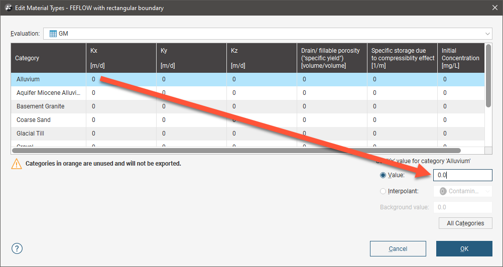 To edit a FEFLOW model material types table, you will first need to evaluate a geological model against the model, which is described in FEFLOW Evaluations above.