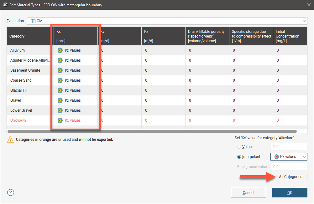 To use the interpolant for all the values in the selected column, click the All Categories button. The window will be updated to show that the interpolant values will be used for that column: