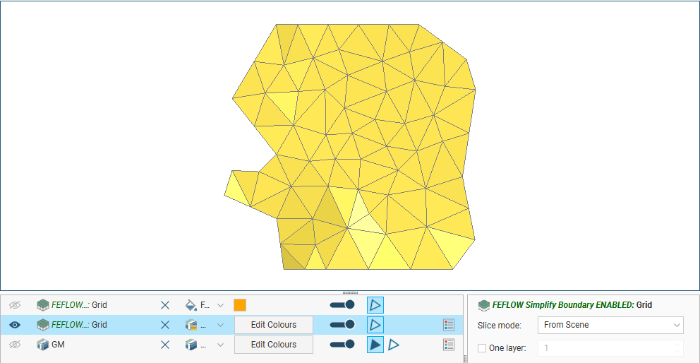 When the boundary is set from another object in the project, the Simplify boundary option can be used to reduce the number of points along the boundary. A lower Tolerance value increases the number of points along the boundary. The two settings together let you define a basic boundary with elements that are roughly uniform in size, set by the value of Element size. Here, a grid has been created from a geological model with the Simplify boundary option enabled: