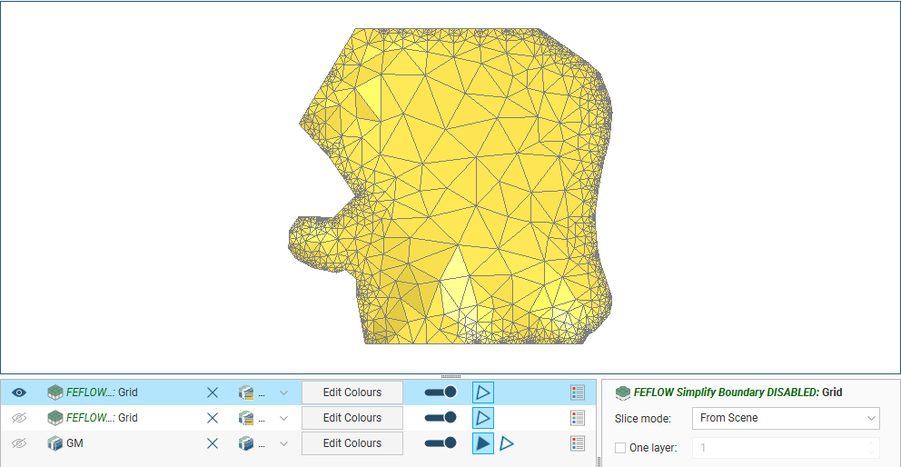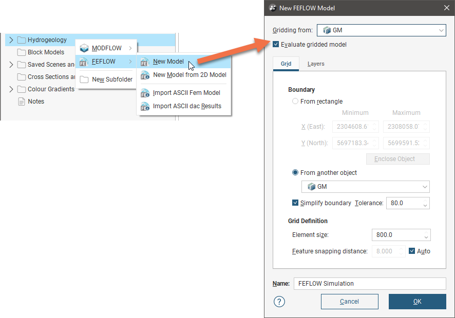 - For 3D FEFLOW models created in Leapfrog Geo, the geological model used in defining its layers is automatically evaluated, unless the Evaluate gridded model option is disabled.