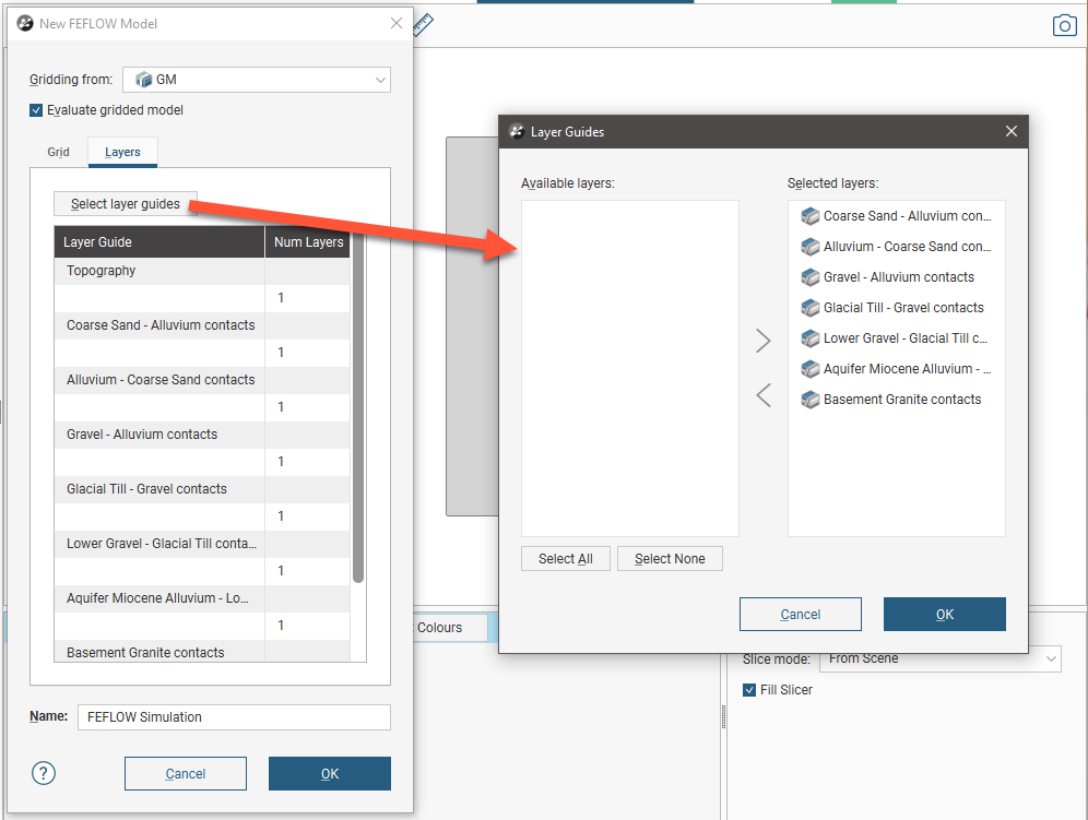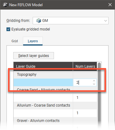 Click on the Layers tab to see the layers that will be used in the new 3D model. By default, the layers from the Gridding from model are selected as layer guides, but you can change this by clicking the Select layer guides button and changing which layers are used: