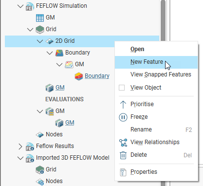 To add features to the FEFLOW model, expand it in the project tree, then right-click on the 2D grid object (